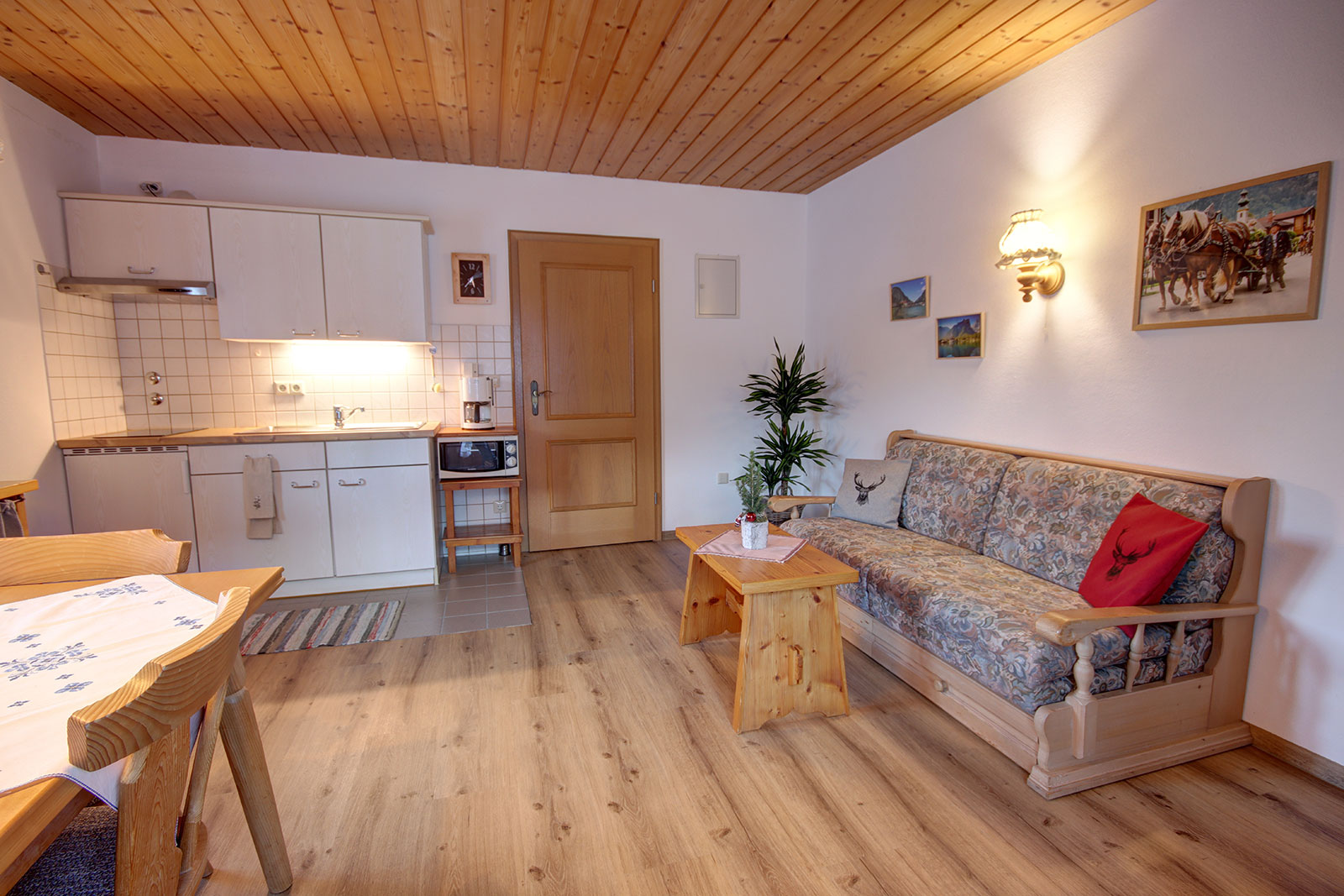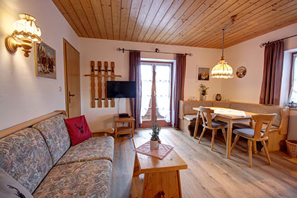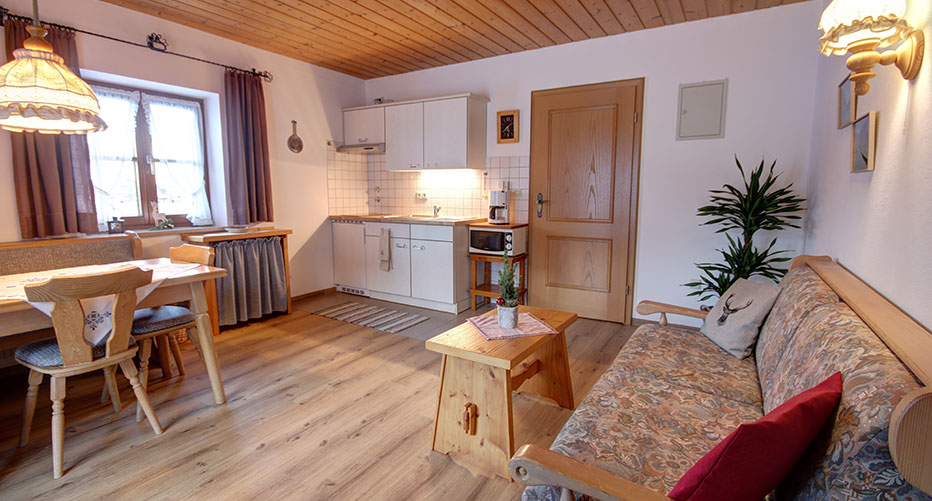 Unsere Ferienwohnung Rauschbergblick für 2-4 Personen und 40qm Wohnfläche besteht aus einem großzügigem, gemütlichem Wohnraum mit großem Balkon, der einen herrlichen Blick auf die Berge gibt. Vom Wohnraum geht es in das separate Schlafzimmer mit großem Doppelbett und dem direkt angrenzenden Bad. Der Wohnraum lädt mit seiner typisch bayrischen Essecke zu geselligen Stunden ein und in der voll ausgestatteten Küchenzeile lassen sich schmackhafte Gaumenfreuden zu jeder Tageszeit zaubern.